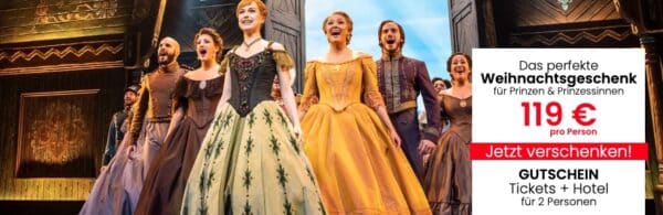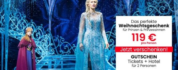 Der Gutschein ist nur gültig, wenn 2 Personen die Aktion nutzen (man bezahlt also 2x 119€) – und, weitere Personen sind (natürlich gegen Aufpreis) bei der Einlösung hinzubuchbar. Den Musical-Fans unter euch wünsche ich viel Spaß mit der Eiskönigin! 👸