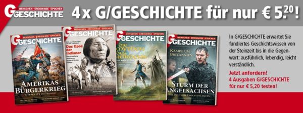 Von Apartena gibt es mal wieder ein super interessantes kleines Schnupper-Abo für euch: 3 Ausgaben + 1x Sonderheft des Magazins G/Geschichte für 5,20€. Wenn Interesse besteht, solltet ihr also auf jeden Fall mal mitmachen – die Kündigen kann man ja komfortabel via Mail rausschicken. Und bisher hatte euch die Zeitschrift ja echt gefallen.