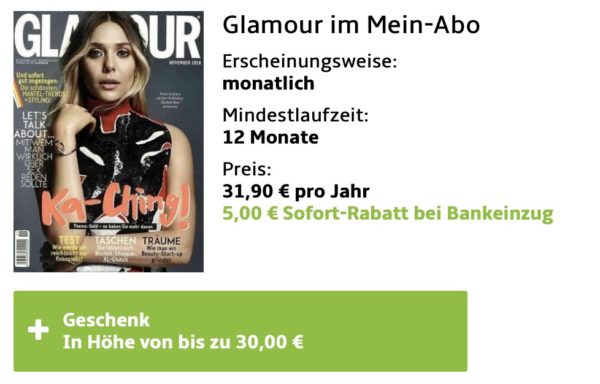 Presseshop.news hat ein cooles, kleines Jahresabo für die Mädels im Angebot: 4 Ausgaben der „Glamour“ für nur 11€ 12€ und direkt und ohne Prämie. Hier geht es um Mode, Beauty, Looks, aber auch Psychologie und Partnerschaft, Reise, Lifestyle, Food und mehr!