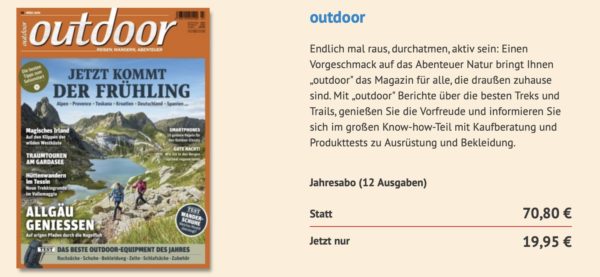 Vom Presseshop kommt gerade wieder mal ein gutes Angebot für alle, die in den Bergen und auf Wanderwegen zu Hause sind: das Jahresabo „Outdoor“ für nur 19,95€ einmalig. Hier müsst ihr niemanden werben und bekommt auch keine Prämie, welche den niedrigen Abopreis ermöglicht. Ihr zahlt einmalig direkt 19,95€ und bezieht ein Jahr lang die Zeitschrift!