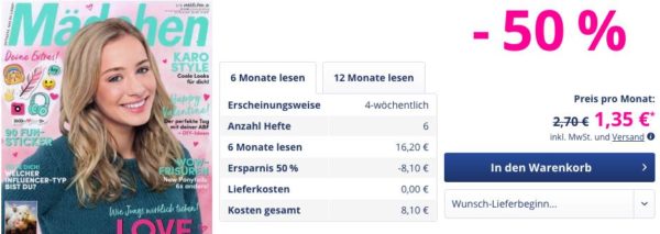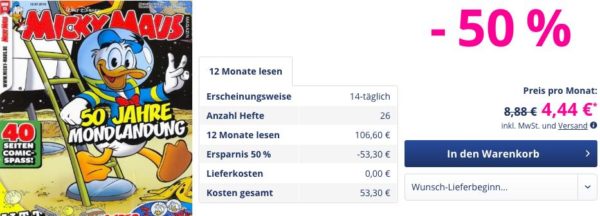 Tipp 🧒 50% Rabatt auf viele Kinder- und Jugendzeitschriften, z.B. Mickey Maus + 5,55€ NL-Rabatt