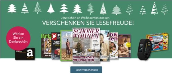 Ein Abo ist immer noch besser als Socken zu Weihnachten, oder? Der deutsche Pressevertrieb (Gruner & Jahr) hat wieder mal einige interessante Jahresabos im Angebot dank dem Empfehlungs-Programm (Kunden werben Kunden) und mit Amazon.de*-Gutscheinen im Wert von bis zu 90€ als Prämie. Ihr könnt je nach Abo aus verschiedenen Gutscheinen auswählen, z.B. Amazon, Tankgutscheine, IKEA, Rossmann oder wahlweise Douglas. Folgende Magazine sind aktuell dabei:
