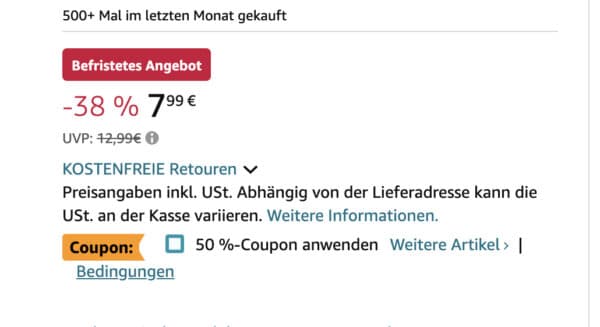Um auf den Preis zu kommen musst du den 50% Coupon verwenden. Coupon muss auf der Produktseite aktiviert werden.