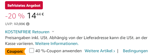 Update Hier ist jetzt der 40% Coupon wieder da. Keiner weiß wie lange, kann jederzeit wieder vorbei sein. Ist ein bisschen teurer als gestern, aber immer noch ein guter Preis!