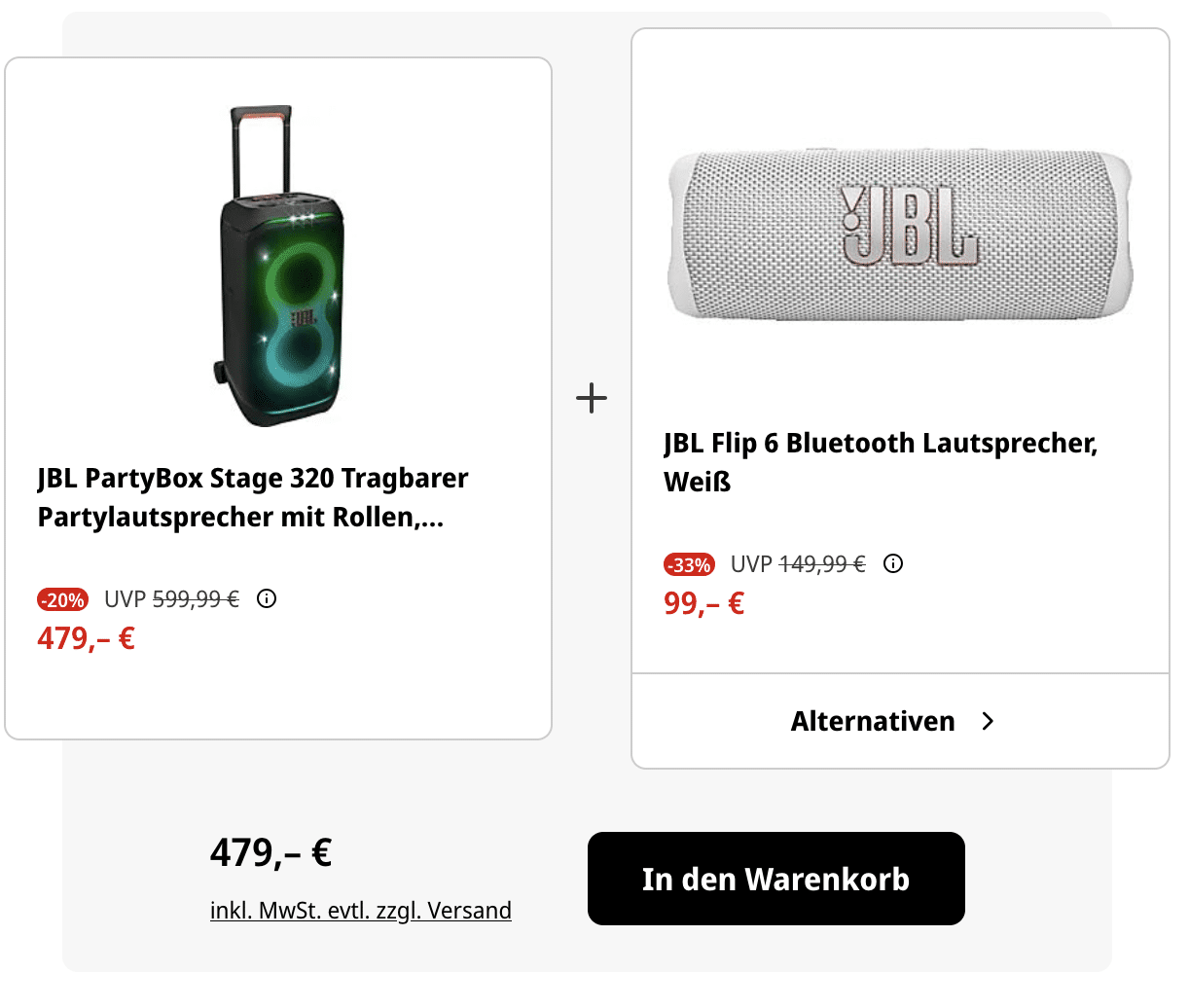 JBL PartyBox Stage 320 + JBL Flip 6 Bluetooth Lautsprecher für 479€ inkl. Versand.