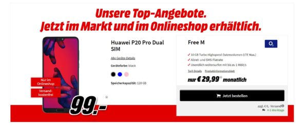 Bei MediaMarkt bekommt ihr gerade die Free M Boost + Allnet/SMS-Flat mit 20GB LTE Internet-Flat für 34,99€ im Monat – und obendrauf noch das HUAWEI P20 Pro Dual SIM für 59€ Zuzahlung.