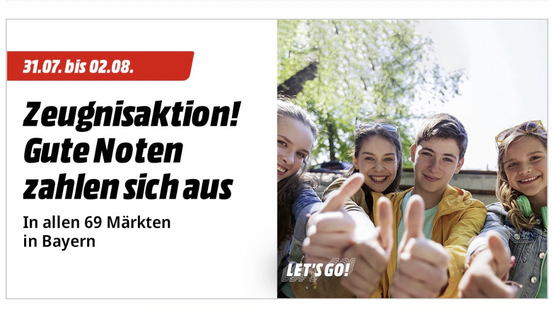 Wer fleißig war und gute Noten vorweisen kann, darf sich vom 31.07. bis zum 02.08. in allen 69 Märkten von MediaMarkt in Bayern seinen Wunschartikel etwas günstiger holen.