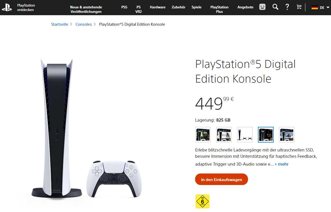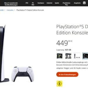 Auf der Sony PlayStation Webseite gibt es derzeit die PS5 Digital Edition (ohne Laufwerk) für 449,99 EUR verfügbar. Im Gegensatz zu vergleichbaren Angeboten derzeit sehr günstig. Bei Amazon kostet diese Variante leicht über 500 EUR und bei Otto circa 550 EUR.