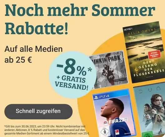 *Gilt bis zum 30.06.2023 um 23:59 Uhr. Nicht kombinierbar mit anderen Aktionen. 8 % Rabatt und kostenloser Versand auf das gesamte Medien-Sortiment ab einem Mindestbestellwert von 25 €.