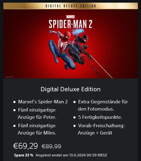 Im PlayStation Store bekommt man für die PS5 die Deluxe Edition von Spider-Man 2 für 69,29€ statt 89,99€ zum Download. Des Weiteren ist die Collector’s Edition für 169,99€ statt 225€ verfügbar. Angebot endet am 13.6.2024 um 00:59 Uhr (MESZ).