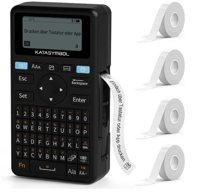 • Einfaches Drucken im Dualmodus: Individuelle Etiketten und schneller Druck über QWERTZ-Tastatur/KATASYMBOL-App