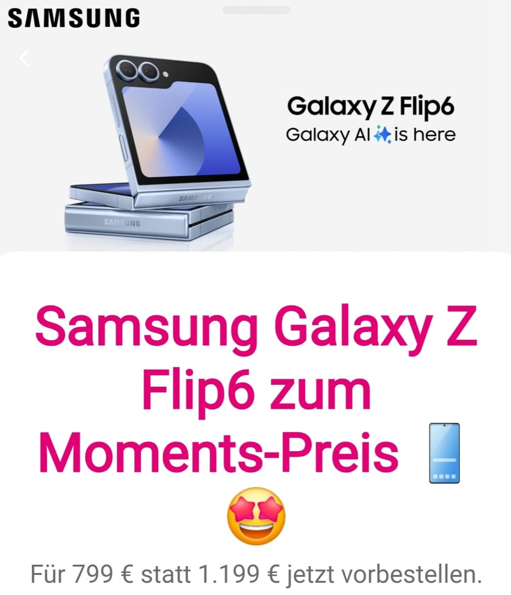In der Telekom Magenta Moments App könnt ihr euch einen Code für das neue Samsung Smartphone, das Galaxy Z Flip6 mit 256 GB zum Vorteilspreis sichern.