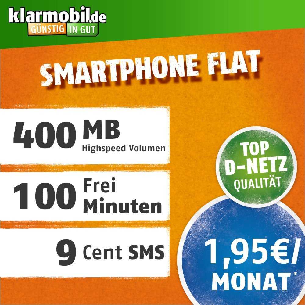 Nur heute kannst Du ein sehr günstiges Angebot zur Klarmobil Flat im Telekom-Netz mit 100 Freiminuten und 400 MB abstauben. Du zahlst dabei gerade mal 1,95 € im Monat! Die Anschlussgebühr beträgt 4€.