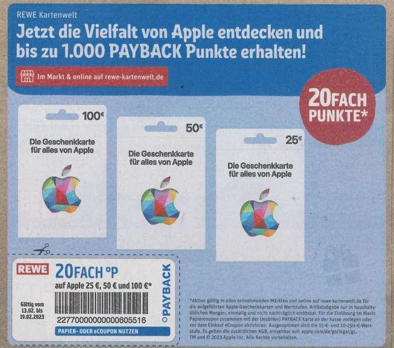 Rewe – 20-fach Payback-Punkte (= 10% Rabatt) auf Apple Geschenkkarten vom 13.-19.02.2023