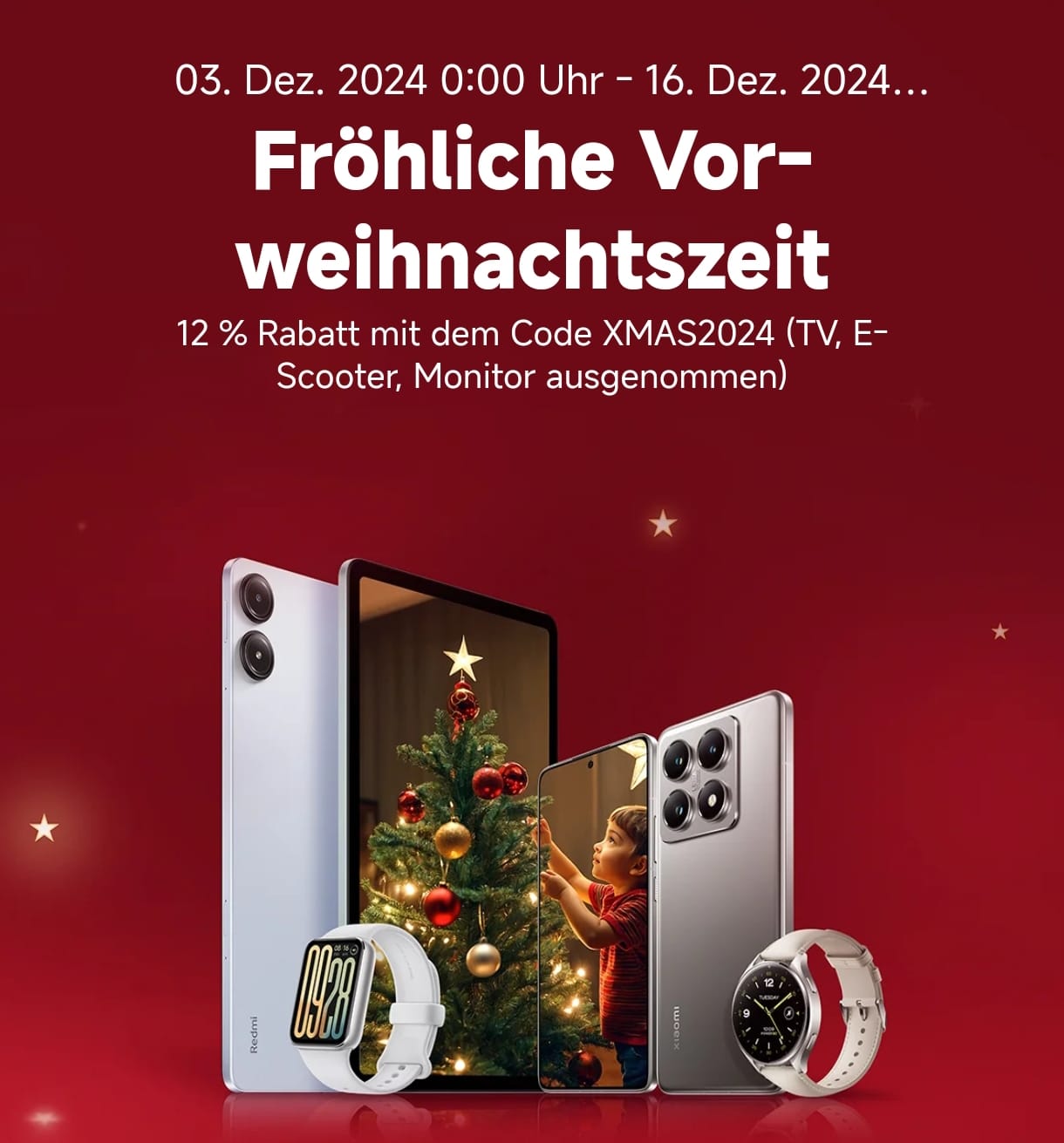 Im Xiaomi Store bekommt man vom 03. Dez. 2024 (0:00 Uhr) – 16. Dez. 2024 (09:59 Uhr) mit dem Gutschein XMAS2024 einen Rabatt von 12% zum Einlösen auf unterschiedliche Produkte (TV, E-Scooter, Monitor ausgenommen). Zusätzlich erhält man 5€ Rabatt pro 100€ Einkaufswert, unbegrenzt (Xiaomi TV, E-Scooter ausgenommen)!