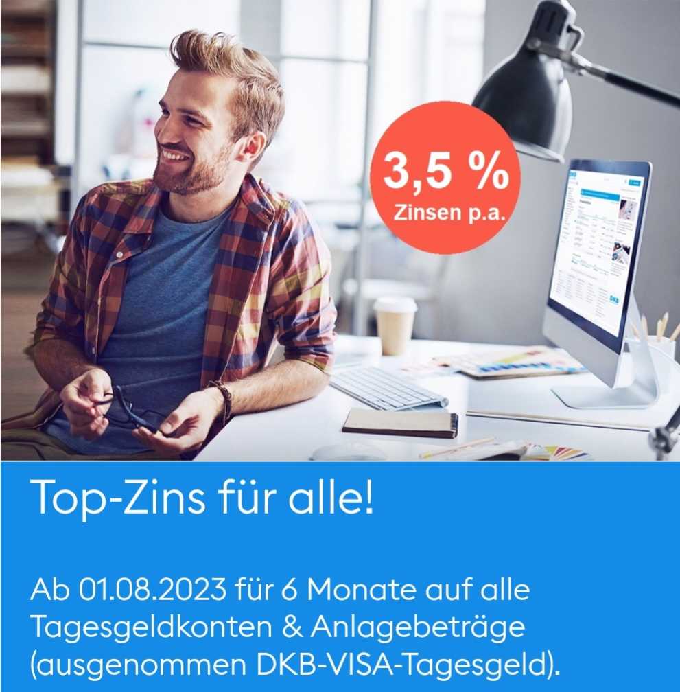 3,5 % Zinsen p. a. variabel ab 01.08.23 für 6 Monate mit unbegrenztem Anlagebetrag (gilt nicht für ein eventuell noch bestehendes DKB-VISA-Tagesgeld).