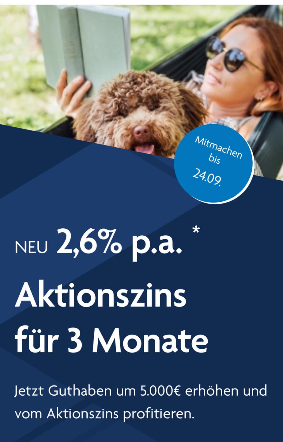 Zur Qualifikation für den Aktionszins erhöhen Sie Ihr Guthaben um 5.000€ – oder mehr – bis zum 24.09. im Vergleich zum Stand des Guthabens am 02.09.2025.