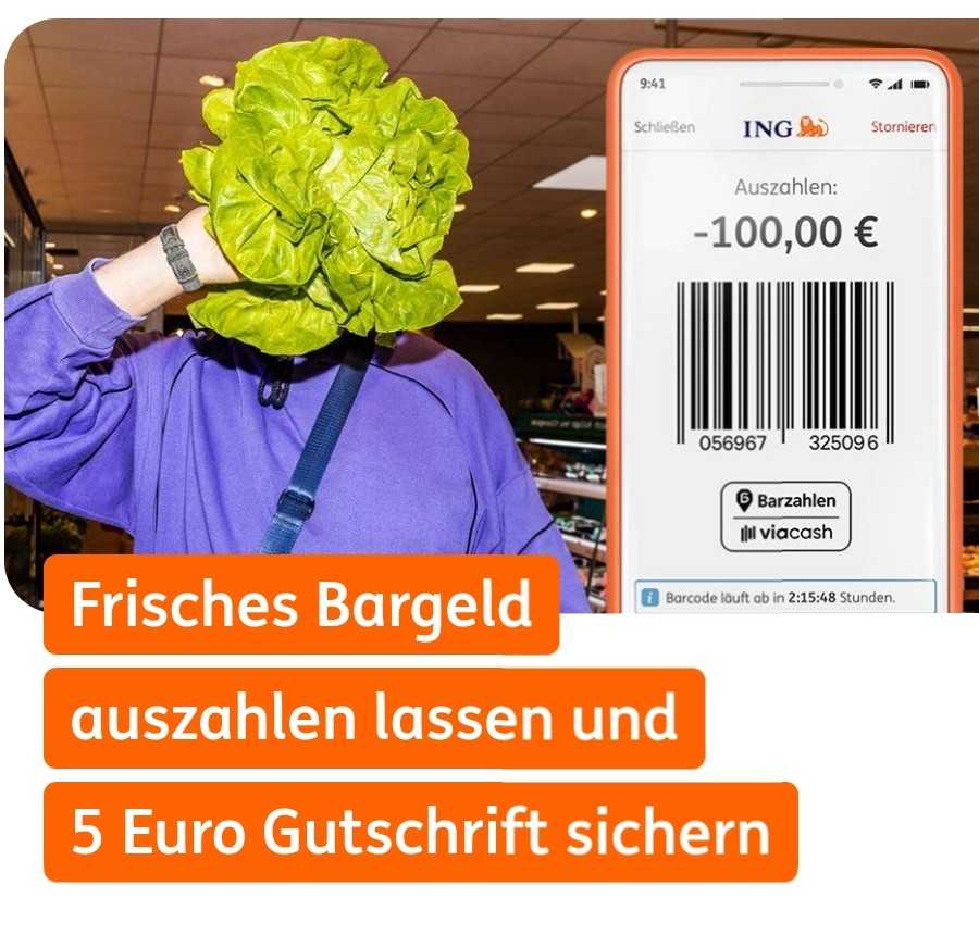 Wenn ihr euch dann auch noch bis zum 31.10.2023 mindestens zweimal Bargeld (ab 10 Euro) bei teilnehmenden Handelspartnern an der Kasse auszahlen lässt, schenkt euch ING 5€.