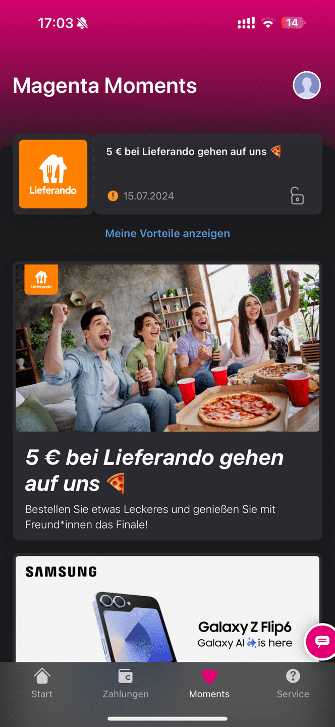 In der Magenta App von der Telekom gibt es unter Moments einen 5€ Lieferando Gutschein abzuholen (MBW10€).