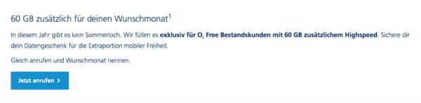 o2 Free Kunden können gerade 60GB Datenvolumen für einen Monat ihrer Wahl bekommen. Dazu müsst ihr über die Seite bei o2 anrufen und euren Wunschmonat nennen.