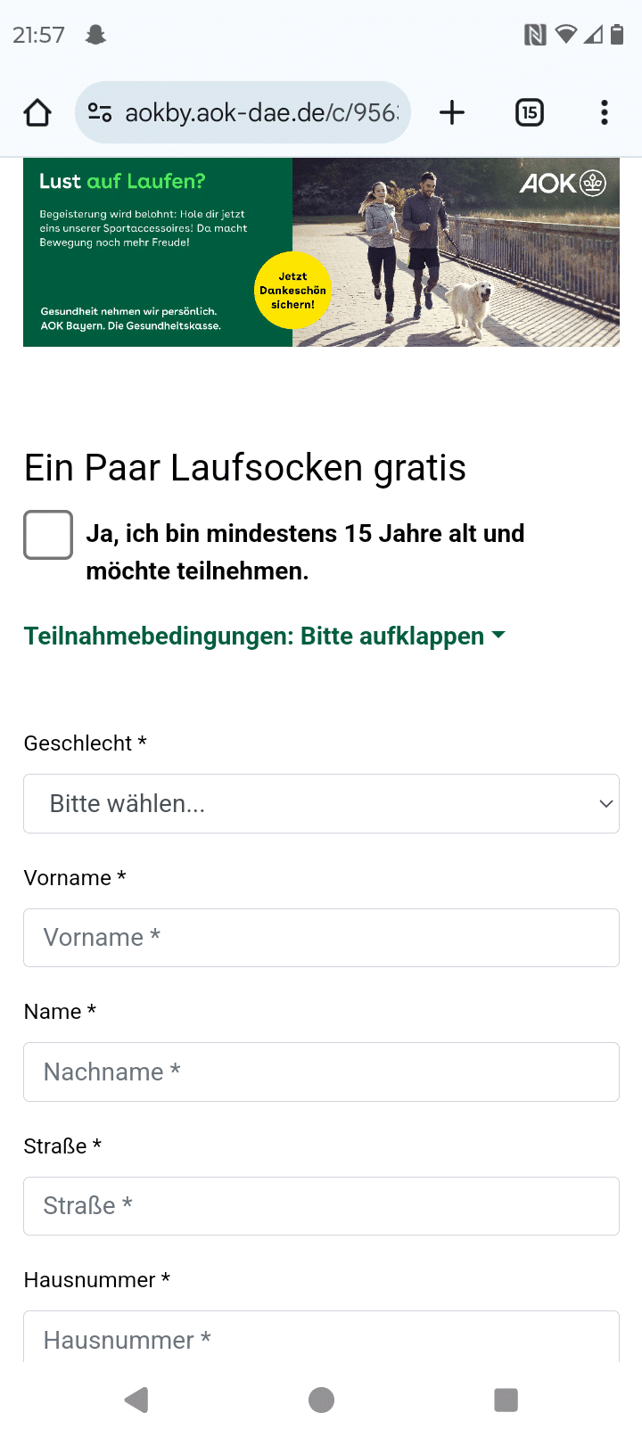 Hey Leute aktuell gibt die AOK wieder gratis Laufsocken ab. Formular ausfüllen fertig.schnell sein lohnt sich .sobald die Aktion endet durch erfasung des Erfassungszeitrahmens schließe ich auch den Deal.