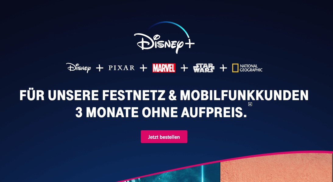 Alle MagentaMobil-, MagentaZuhause- und MagentaTV-Kunden erhalten Disney+ volle sechs Monate komplett kostenlos. Danach können sich Telekom-Vertragskunden einen Preisvorteil sichern und zahlen statt dem Standard-Preis (6,99€ mtl.) nur 4,88€ pro Monat.