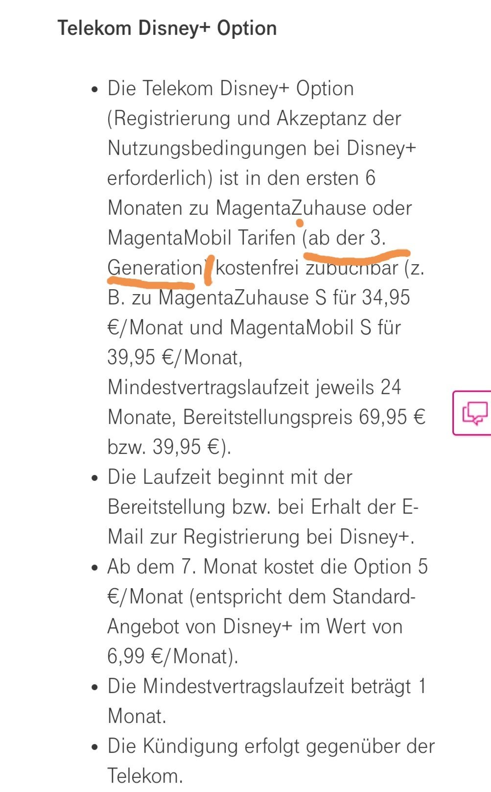 • Die Telekom Disney+ Option (Registrierung und Akzeptanz der Nutzungsbedingungen bei Disney+ erforderlich) ist in den ersten 3Monaten zu MagentaZuhause oder MagentaMobil Tarifen (ab der 3. Generation) kostenfrei zubuchbar (z. B. zu MagentaZuhause S für 34,95 €/Monat und MagentaMobil S für 39,95 €/Monat, Mindestvertragslaufzeit jeweils 24 Monate, Bereitstellungspreis 69,95 € bzw. 39,95 €).