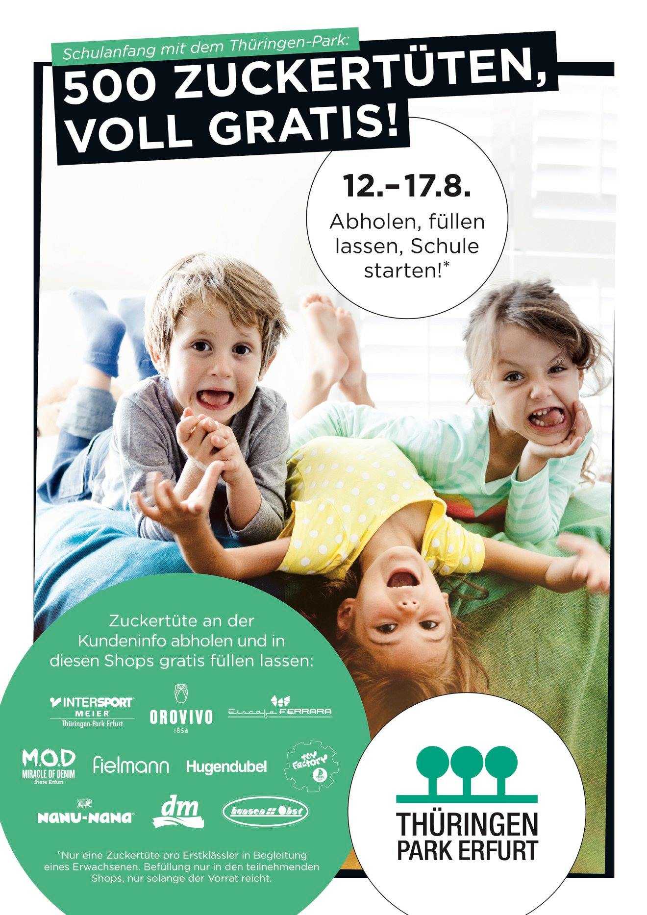 Im Thüringen Park in Erfurt können Schulanfänger in Begleitung eines Erwachsenen sich an der Information im Erdgeschoss (neben der mittleren Rolltreppe) eine leere Zuckertüte abholen. Zeitraum 12.08.2019 bis 17.08.2019