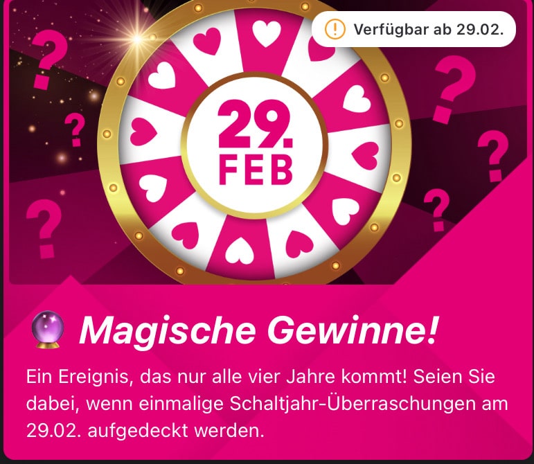 nur am 29.2.24 von 9-24 Uhr könnt Ihr als Telekom Kunde wieder am Glücksrad drehen.