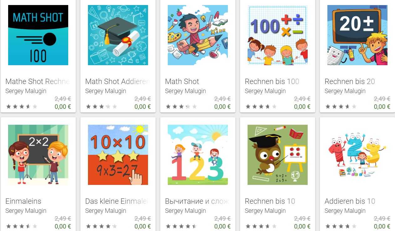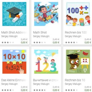 Derzeit gibt es alle 50 Mathe-/Rechen-Lern-Apps von Sergey Malugin kostenlos im Google-Play-Store.
