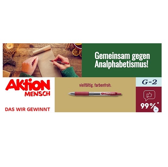 Wenn ihr einen G2-7 Gelschreiber in der Strichstärke 0.7 kauft, könnt ihr – nach dem erfolgreichen Upload des Kassenbons – ein Jahreslos für die Aktion Mensch als Sofortgewinn per E-Mail abstauben.