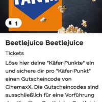 Einfach in der App auf BEETLEJUICE klicken, den Code BEETLEJUICE eingeben und zwei Käfer erhalten. Diese könnt ihr dann gegen zwei Kinotickets eintauschen.