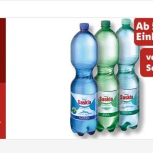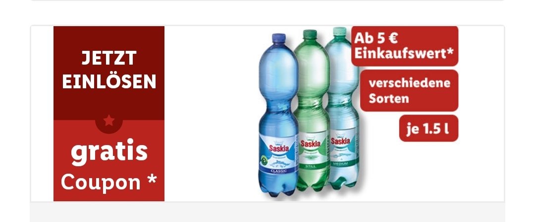 Nur heute und morgen bekommt ihr bei Lidl eine 1,5l Flasche Saskia Mineralwasser eurer Wahl zu eurem Einkauf von mindestens 5 € gratis dazu .