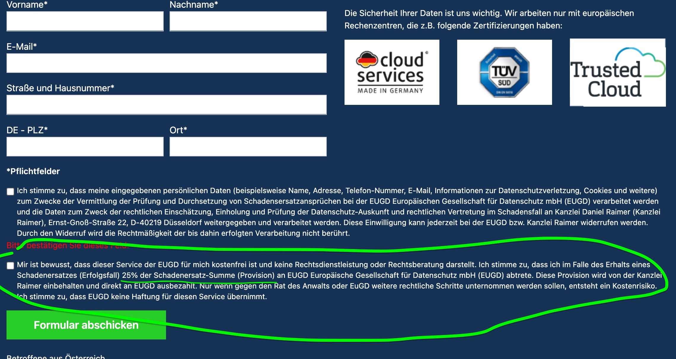 golsdesbel 21.04.2021, 16:45Mach das mal lieber über die europäische Gesellschaft für Datenschutz: https://eugd.org/schadenersatz/sita/