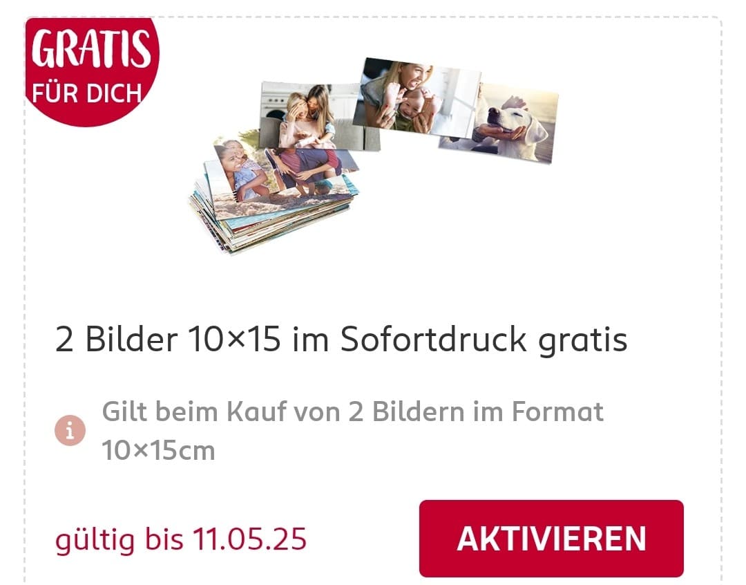 Bei Rossmann gibt es in der App zurzeit 2 Fotos 10×15 cm im Wert von 0,54 € gratis. Gilt an allen Rossmann Sofortdruck Stationen außer Kodak Moments Little Pix Stationen. Einfach in der App aktivieren und zusammen mit dem Bon aus der Fotostation an der Kasse vorlegen. Laufzeit: bis 11.05.2025.