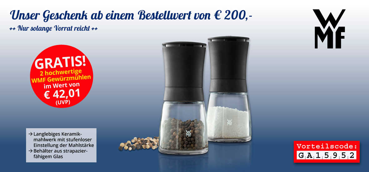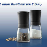 - ab 200€ Bestellwert ein schönes Gewürzmühlen Set, bestehend aus einer Salz- und einer Pfeffermühle, geschenkt.