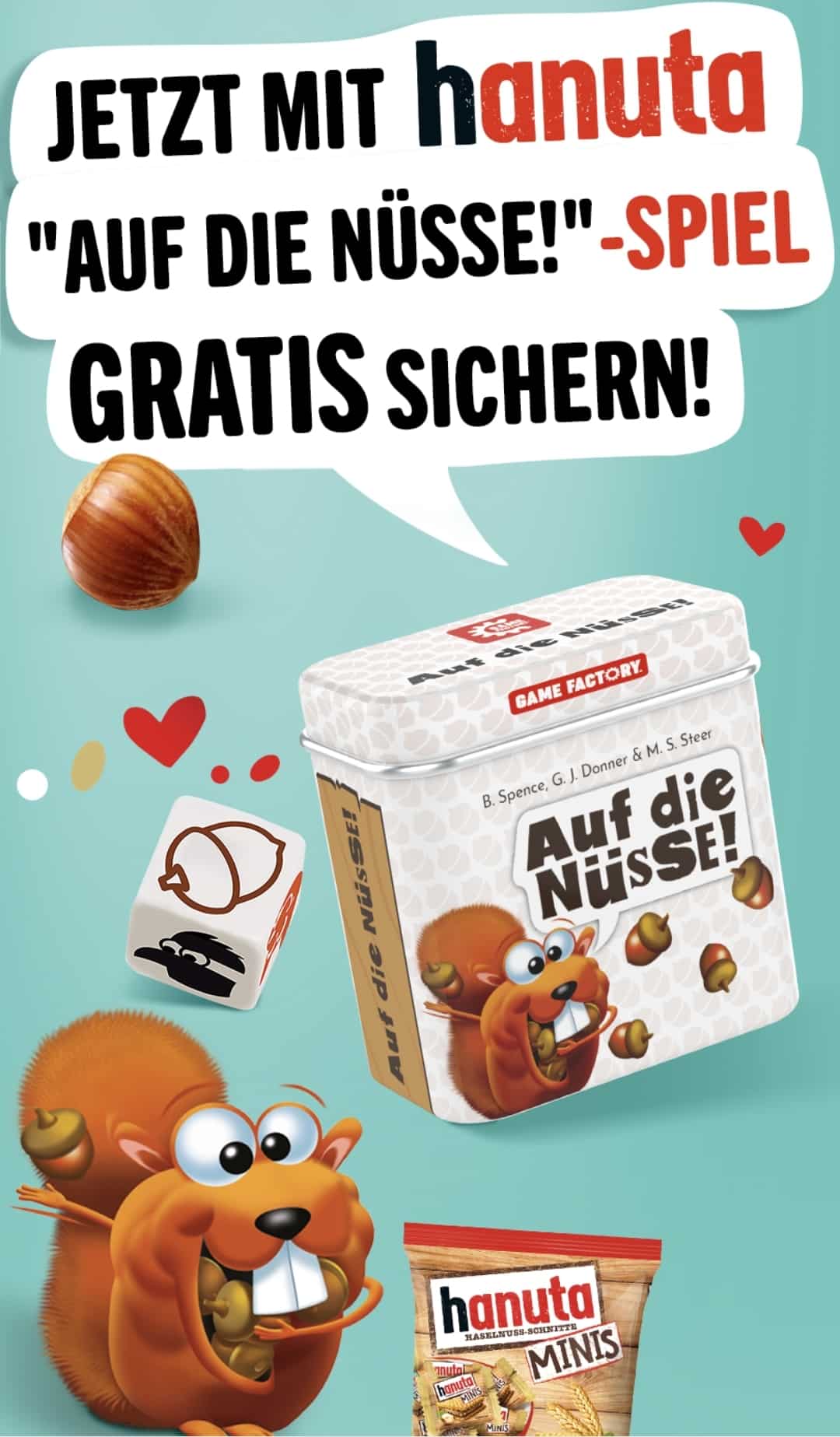 Seid ihr Naschkatzen auch so Fans von Hanuta? Dann solltet ihr euch diese Aktion nicht entgehen lassen! Zwischen dem 12.08. und 02.11.24 könnt ihr euch das Spiel „Auf die Nüsse“ gratis nach Hause schicken lassen, wenn ihr zwei teilnehmende Hanuta-Produkte kauft.