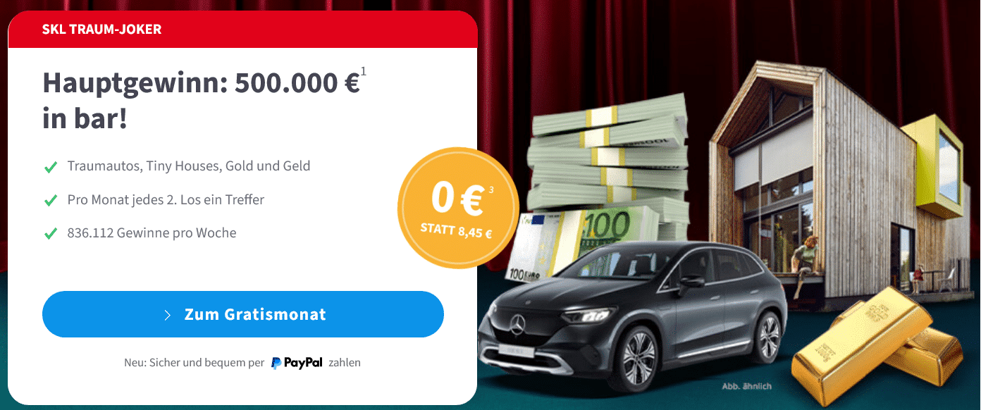 Jede Menge Geld und Sachpreise: Spiele 1 Monat SKL Traum-Joker zum Nulltarif – der Gutschein wird automatisch berücksichtigt.