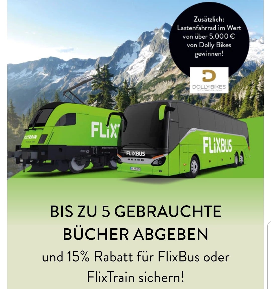 Als Belohnung für eure Buchspende bei Hugendubel bekommt ihr einen Rabatt-Coupon für eure nächste Fahrt mit FlixBus und FlixTrain.