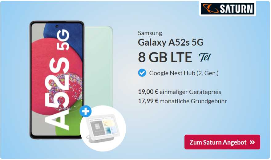 17,99 € Grundgebühr: Galaxy A52s für 19 € + Google Nest Hub + 8 GB LTE + Allnet-Flat (Super Select M)