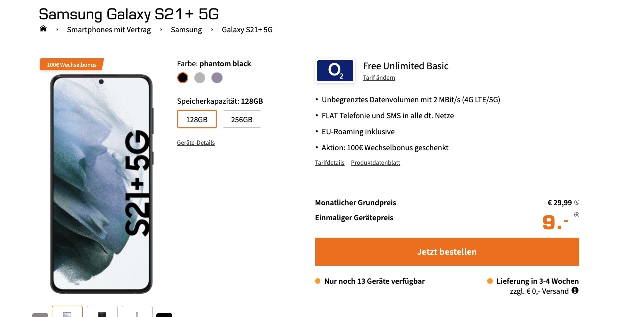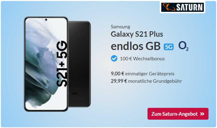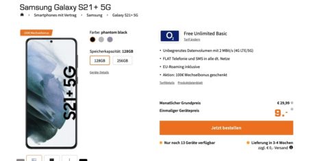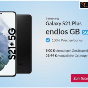 Bei Saturn gibt es das Galaxy S21 Plus (128 GB) jetzt sogar mit einen endlosen Datenflat + Allnet-Flat mit nur 29,99 € Grundgebühr und 9 € Zuzahlung. Ihr könnt mit bis zu 2 MBit/s im Downstream ohne Einschränkungen surfen. Bei der Mitnahme der Rufnummer winken dank der o2-Aktion noch 100 € Wechsel-Bonus. Schon erfreulich gut das Angebot!