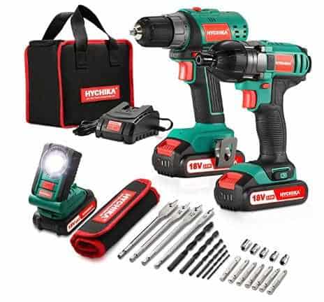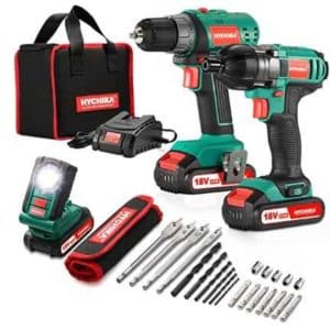 - 1 x HYCHIKA 18V Akku-Bohrschrauber, 1 x HYCHIKA 18V Akku-Schlagschrauber, 22 x Zubehörteile, 2 x 18V 2000 mAh Lithium-Batterien, 1 x Schnellladegerät, 2 x Gürtelschnallen, 1 x Werkzeugtasche, 1 x Tragetasche, 1 x Benutzerhandbuch