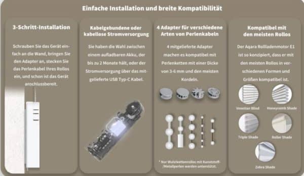 - [Lange Batterielebensdauer] Sie müssen sich nicht jede Woche um das Aufladen kümmern. Der Aqara Rollladenmotor E1 hat eine Akkulaufzeit von 2 Monaten, was mehr als doppelt so lange ist wie bei anderen ähnlichen Produkten. Der vielseitigste Typ-C-Anschluss wird zum Aufladen des Geräts verwendet (USB-C-auf-USB-A-Kabel ist im Lieferumfang enthalten).