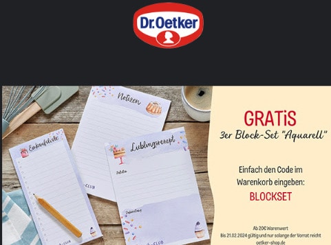 Bestelle bis 21.2.2024 in online Shop von Dr. Oetker für mindestens 20€ und erhalte mit dem Code: BLOCKSET das 3er Block-Set „Aquarell“ im Wert von 6,90 € gratis dazu – solange der Vorrat reicht!