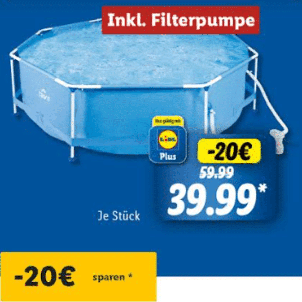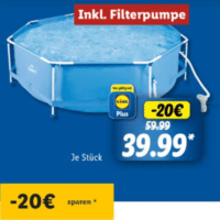 Auch wenn das Wetter im Moment nicht so der Hit ist: Der Sommer kommt bestimmt! 😊 Und bei Lidl könnt ihr jetzt dank Lidl Plus App ein richtig cooles Schnäppchen für heiße Sommertage machen: Dort gibt es den Crivit Metal-Frame-Pool mit 300cm Durchmesser, inklusive Filterpumpe, für nur 39,99€ statt 59,99€!