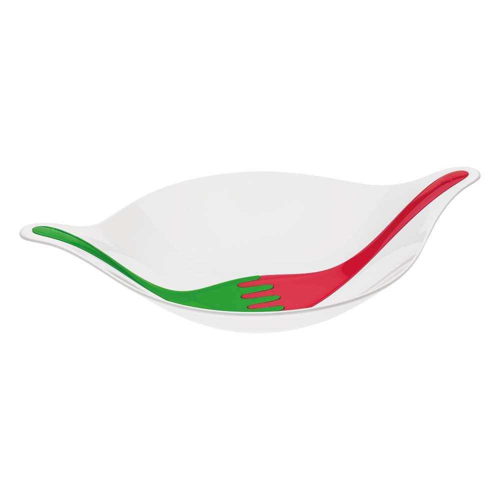 Eine der schönsten Salatschalen in kompakter Größe für kleinere Haushalte und Portionen und natürlich für jeden Tag. Die geschwungene Form macht jede Mahlzeit auch zu einem optischen Genuss. Das integrierte Salatbesteck ist immer griffbereit und macht als dekoratives Element aus der Schale ein einzigartiges Designobjekt. • spülmaschinengeeignet • BPA-frei • Melamin-frei • mit integriertem Salatbesteck • kompakte Größe für jeden Tag Maße: Höhe: 12,7 cm Länge: 48,6 cm Breite: 32,9 cm Füllmenge: 3 l Farbe: Weiß mit Rot / Grün Material: Acryl