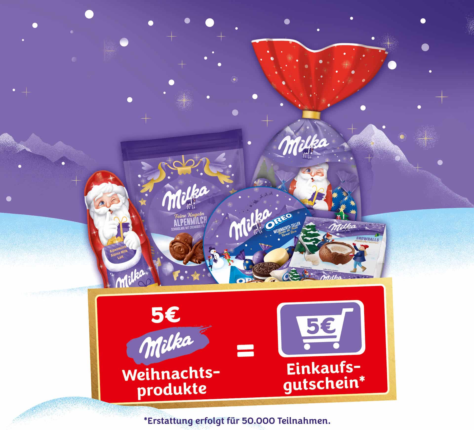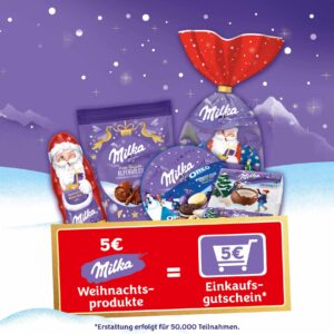 Die Aktion, bei der ihr für den Kauf von Milka Weihnachtsprodukten im Wert von 5€ einen 5€-Einkaufsgutschein erhaltet, findet vom 09.12.-26.12.2024 in allen Märkten in Deutschland statt.