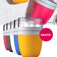 Hab Dein Lieblingsmüsli immer und überall dabei! Dank 2 separaten Behältern kannst Du es mit Milch, Joghurt oder Obst frisch zusammenmixen. Exklusiv bei uns: ein Müsli 2Go Becher mit neuem, extra großem Deckel und noch mehr Platz für Deine Kreativität (oder circa 100 Gramm Müsli). Sicher Dir Deinen perfekten Frühstücks-Begleiter gratis* – in 5 stylischen Farben.
