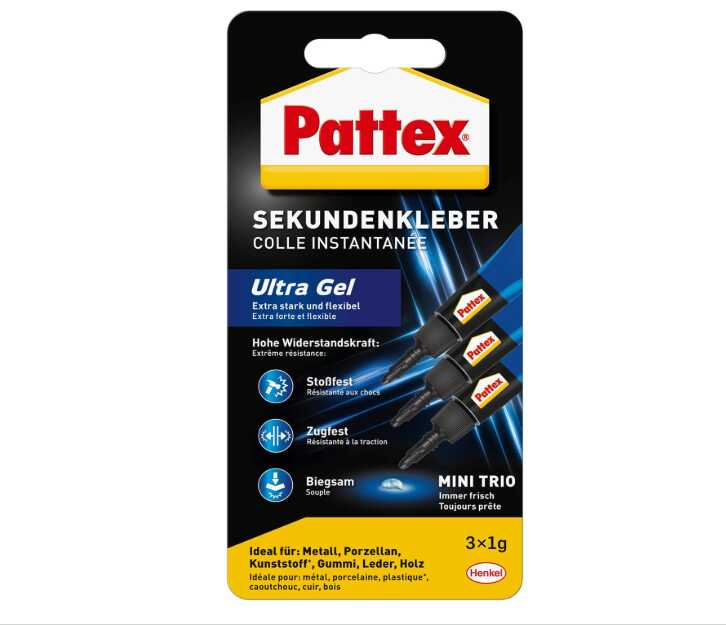 - Praktischer Lieferumfang: 3 Tuben zu je 1 g Pattex Sekundenkleber Ultra Gel Mini Trio, 3 original versiegelte Mini-Tuben, stark & flexibel, lösemittelfrei, Cyanacrylat, farblos