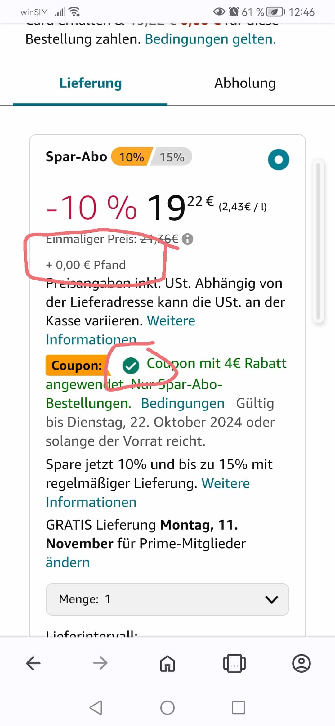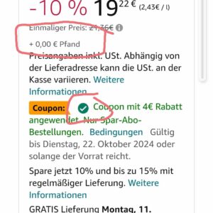 Ich kenn den Mate Tee noch nicht, aber habs eben zum Schnäppchenpreis bestellt. Die Dosen sind 0,33 Liter, es gibt 4 Euro Rabatt mit Coupon und obendrauf gibt es noch 10% bis 15% Rabatt im Sparabo. Also setzt euren grünen Haken und richtet Abo ein, jederzeit stornierbar. Den Pfandgewinn von 6 Euro nehm ich natürlich zusätzlich mit. Endpreis abzüglich Pfand daher unter 10 Euro, je nach Sparabo Höhe.